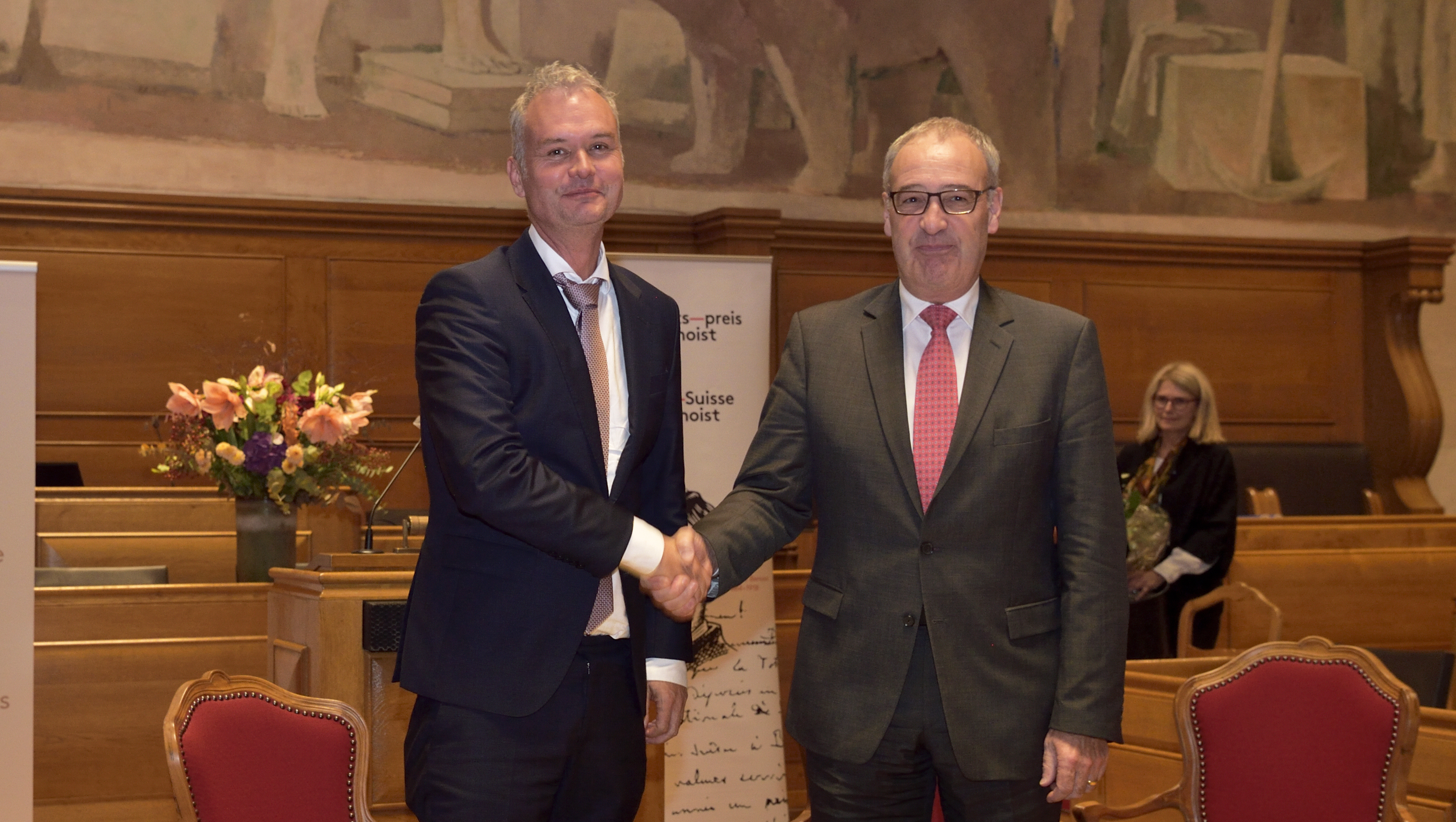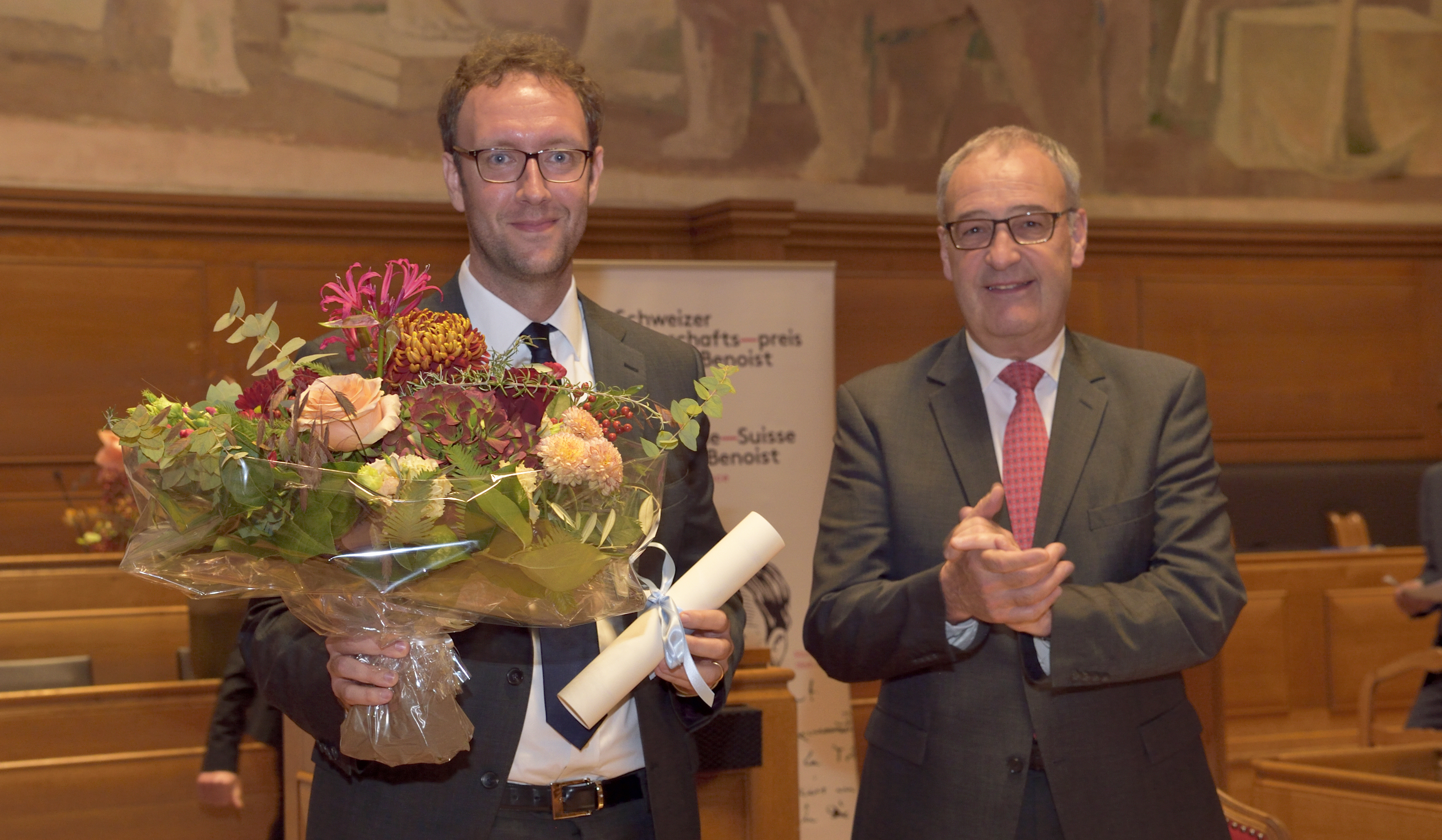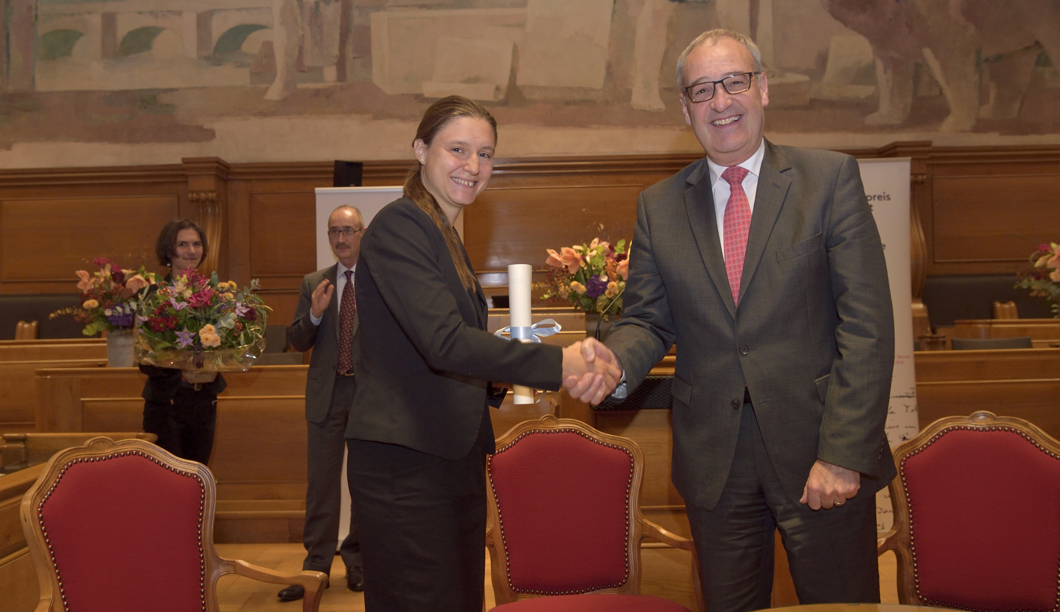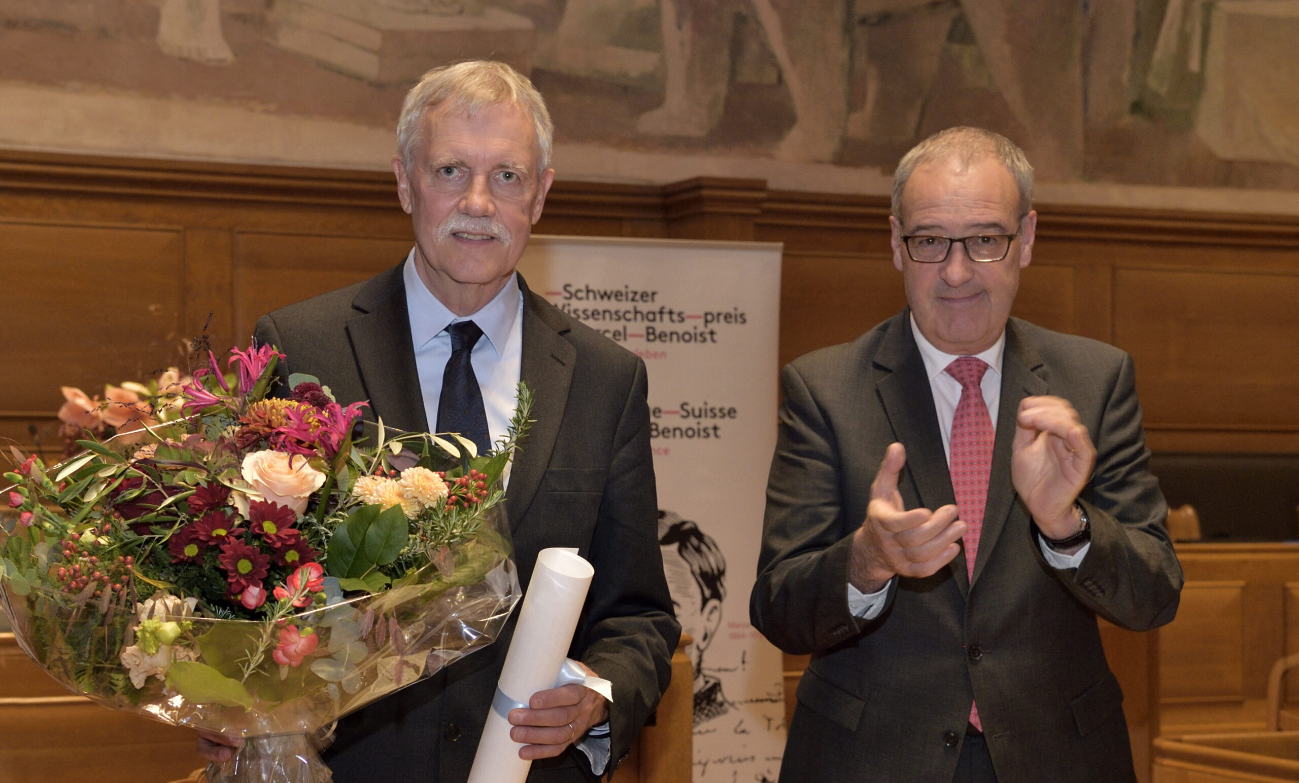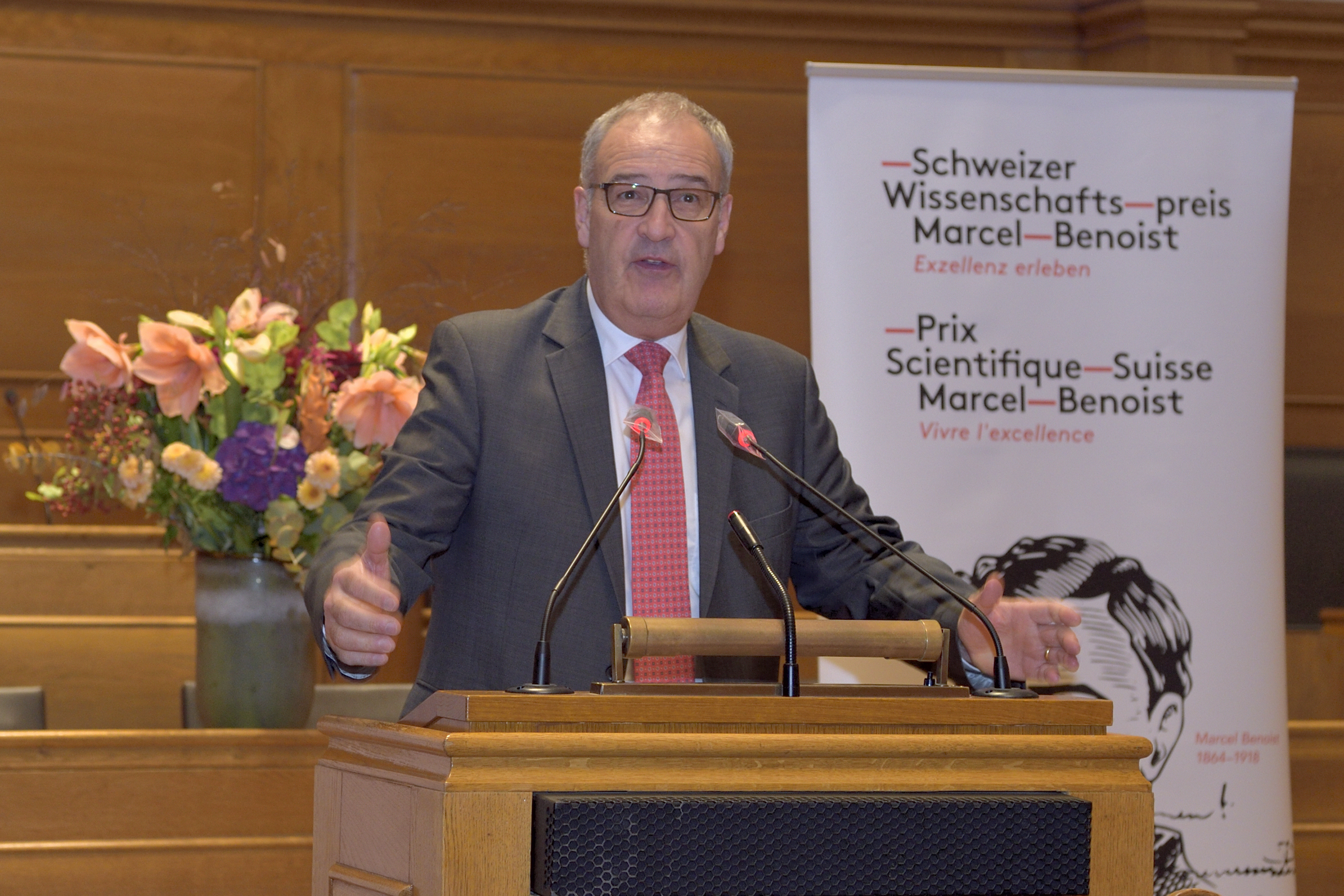Lors de son discours officiel, Guy Parmelin, président de la Confédération et président de la Fondation Marcel Benoist, a félicité la lauréate et les lauréats. Il a insisté sur la bonne collaboration mise en place entre la Fondation Marcel Benoist et la Fondation Latsis. Ces deux fondations poursuivent ensemble l’objectif de promouvoir l’excellence de la recherche en Suisse. Dans le même temps, elles ont à cœur de montrer à un large public que la recherche est importante pour la société tout entière et qu’elle lui est profitable. L’apport de la recherche à la société était déjà la préoccupation centrale du fondateur Marcel Benoist et il l’est toujours aux yeux des donateurs privés des fondations, auxquels le président de la Confédération a adressé ses remerciements pour leurs dons en faveur de l’encouragement de la recherche scientifique suisse.