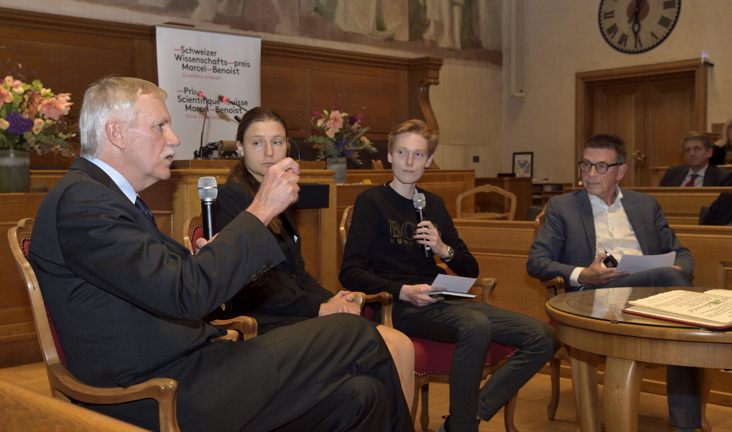 Durant l’après-midi précédant la cérémonie, de jeunes talents ayant participé aux concours de Science et Jeunesse et des Olympiades de la Science ont eu la possibilité, dans le cadre d’un atelier, d’échanger avec les lauréats des prix scientifiques sur leurs travaux de recherche. Au cours de la cérémonie, les deux tables rondes avec les lauréats ont aussi été placées sous le signe de l’échange : une jeune et un jeune ayant pris part à l’atelier ont pu poser des questions passionnantes à la lauréate et aux lauréats. Au travers des explications du professeur Rudolf Aebersold, les participants ont par exemple pris conscience du fait que toute modification, aussi infime soit-elle, dans la structure cellulaire d’un protéome peut être à l’origine de pathologies graves. La professeure Maryna Viazovska a confié aux jeunes qu’elle a appris par hasard que les mêmes méthodes servant à la résolution de problèmes d’empilement de sphères étaient utilisées en physique quantique, mais pour résoudre un problème complètement différent. Le professeur Nicola Aceto a précisé qu’il cherchait à mettre au point de nouveaux médicaments qui soient capables non pas de détruire les cellules responsables de l’apparition de métastases, mais de les empêcher de s’amasser pour créer des métastases. Le professeur Thomas Berger a notamment fait remarquer que le nombre de personnes ayant eu recours aux offres de thérapies de couple en ligne a littéralement explosé dans le sillage du confinement au printemps 2020 et que la baisse de la demande a coïncidé exactement avec la réouverture des magasins de jardinage et des salons de coiffure. Une anecdote qui a provoqué des rires et pas uniquement chez le maître de cérémonie, le professeur Matthias Egger, président du Conseil national de la recherche du FNS.